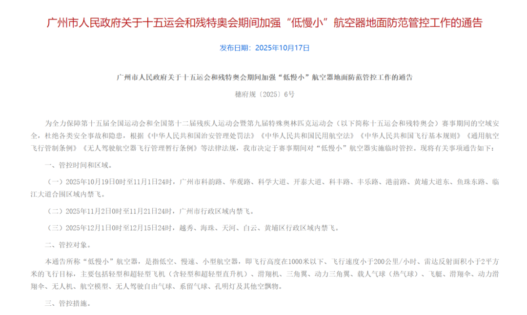 10月17日 广州市东说念主民政府发布 对于十五运会和残特奥会时刻 加强“低慢小”航空器大地防患管控责任的晓喻 全运会时刻 无东说念主机等“低慢小”航空器 受临时管控 📣📣📣 “低慢小”航空器“黑飞”? 对于违违禁飞公告的步履 广州白云警方将照章查处 案例一 小区楼顶“黑飞”被制止 10月25日18时许,广州白云区同和街说念某小区近邻,有无东说念主机疑似“黑飞”。白云警方接到陈迹后,立即安排民警开展排查,随后在该小区某房屋顶层,现场查获正在操作该无东说念主机的王某。 经查,王某系未成年东说念主